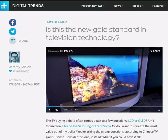 知名科技媒体Digital Trends专门撰文叠屏电视海信ULED XD进行了报道:电视技术新的黄金标准?液晶还是OLED?三星、LG,还是索尼?中国电视巨头海信:这些问题你都问错了!何不考虑这个问题,如果以上这些你都拥有呢?