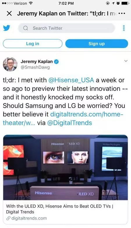 该媒体总编辑Jeremy Kaplan还专门发布twitter点赞叠屏电视:“我大约一周前提前见到了海信的最新产品——它确实让我大为震撼。三星和LG是否该焦虑不安了呢?你们最好相信确实如此。”