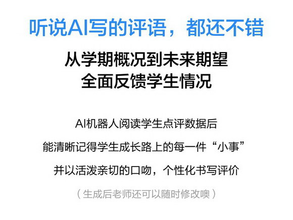每到期末,老师总是忙得不可开交。各种总结工作之外,学生的综合素质评价也是一大难题。为帮助老师更高效、高质地完成评价工作。班级管理工具“班级优化大师”,用人工智能技术对3年来累积的6亿多条学生评价数据进行深度学习,借助AI技术,帮助老师写评语。