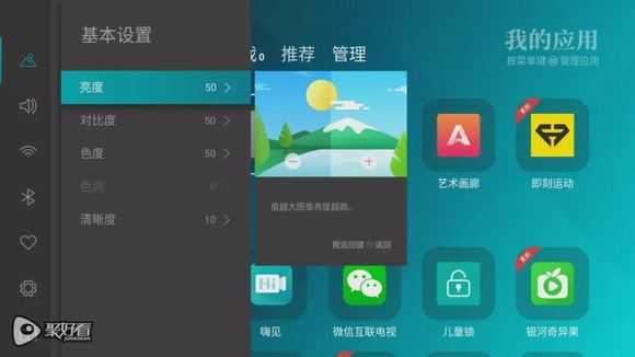 方法三:把电视画面选项里面的亮度对比度清晰度按照自己喜欢的方式下调后会发现电视其实一点都不热,这是从内部降低功率,减少热量的产生。
