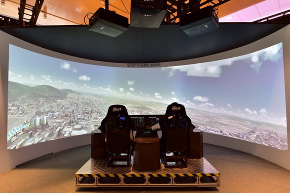 往届人气爆棚的国画飞行模拟视景系统这次实现了全面升级,以3台LP60SL虚拟仿真投影机投射半径为3米的180度弧幕,逼真度更高,体验感更强。国画虚拟仿真投影机具有动态对比度高、延时短、运动兼容性好等核心优势,在国内居于领先水平。