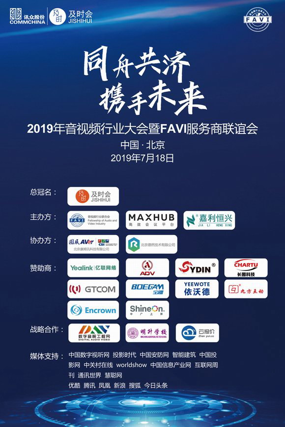 '同舟共济、携手未来”2019年音视频行业大会暨FAVI服务商联谊会,于2019年07月18日顺利在北京黄河京都会议中心成功举办。300余名行业精英齐聚一堂、大咖云集。知名品牌介绍前沿科技,著名专家分享成果经验。还有来自媒体的观察,分析行业前瞻。