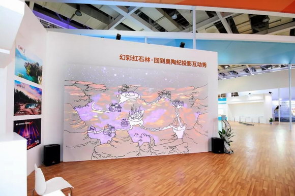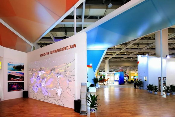 展会另一处的炫彩红石林展项前册样人头攒动。其画面由2台NEC PX1004UL-BK+激光工程投影机叠加而成,再结合导电油墨技术打造成长5米宽3米的趣味互动游戏墙,20000流明的总亮度使画面在白天依然明亮,1920×1200的高清分辨率让细节分毫毕现,以简约风格的动画展现形式,以及极其直观的互动方式向观众展示了“古丈阶”金钉子和红色碳酸盐岩石林的秘密,传播知识的同时还兼具娱乐性和趣味性,成为展会的吸粉神器。