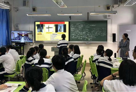 看到老师如变魔术般地,把黑板上的思维导图传到旁边的显示屏,两教室可以共享一块黑板时,即便是已经习惯用希沃交互智能平板上课的广州八十六中的同学们,依然发出“哇!”的一声惊叹。现场领导似乎被孩子们的天真烂漫感染到,也都笑了起来。