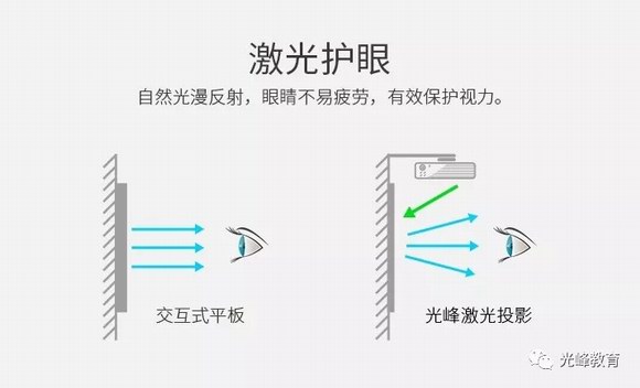 不同于大屏的直射光,光峰激光投影系统是漫反射光入人眼,长时间观看,眼睛不易感到疲劳,更能起到保护视力的作用,许孩子们的未来一个清晰的世界。