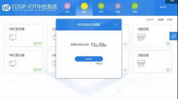 除此之外,EDSIP八爪鱼综合显示应用平台下的另一只爪子——EDSIP-IOT智能管控系统,针对以上会议室、教室、实验室等应用场景,可以实现会议室内设备一键开会、一键闭会,例如只要设定好开会时间,会议室会在规定时间一键自动开启灯、空调、智能会议平板、电动窗帘等需要用到的设备,当会议结束后一键自动关闭这些设备,充当智能小管家,做好会前会后服务后勤工作,为与会者带来极大的便利。