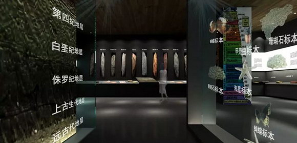 为了让参观者可以更直接的了解到当地象征性地质地貌的剖面组成部分,将当地特色的地质横切面展示出来,并融合移动滑轨屏展示系统和纳米全息透明屏展示系统,让参观者在互动娱乐的同时能对地质标本进科普了解,寓教于乐。