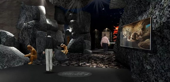将时光倒回远古时期,还原当地古人类生活状态,采用半景画展示系统,通过投影结合场景造型和古人类模型重现历史场景。再以裸眼3D投影