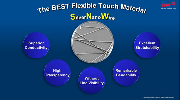吴博士提到,TPK选择纳米银主要是因为纳米银拥有优良导电性外,还具有优异的透光率和可挠性,是柔性触控屏最佳的材料。