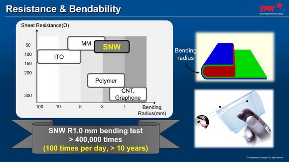 纳米银比起上述的替代方案,可以有很好的弯折性以及导电性,这也是TPK一直在努力的,在R1的弯折测试中,弯折40万次是没有问题的,等于说一天折100次,可以连续使用10年,故吴博士表示,我们相信纳米银这样优异的特性,是可以完美的满足市场的需求。