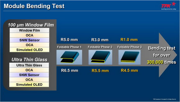 TPK针对触摸屏迭构上,不管是可折叠手机,或者是接下来要选择的Cover film的材料,这些搭配性上,纳米银都有办法可以满足,并且也能承受超过30万次的弯折。