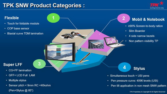 除了可弯折的应用外,纳米银可以满足1-110寸的应用,从小尺寸到超大尺寸交互式电子白板,从去年到今年,TPK都有跟OLED的大厂都有配合开发,可弯折的触摸屏产品已经开始量产,且超大尺寸的触摸屏产品也已经送样验证。