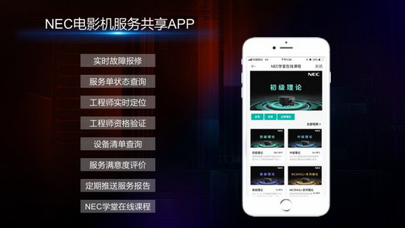 在放映产品上,NEC一马当先,勇于创新;在售后服务上,NEC更是臻心服务,无微不至。于业内首家推出“NEC电影机服务共享APP”,实现了用户实时故障报修,服务单状态查询,工程师实时定位等多种便捷功能,大大提高了服务效率和质量。近期新上线的“NEC学堂在线课程”模块,也进一步完善了NEC售后服务体系,帮助客户实现技能升级,为行业技术人员储备提供助力。NEC售后服务真正做到了专业、高效、交互。