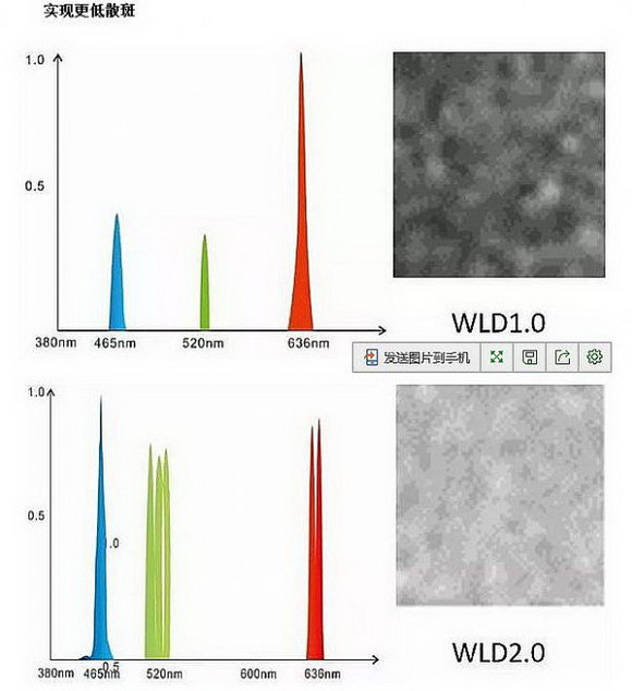 和2.0比较,3.0方案会在继承2.0技术框架的基础上,进一步改良激光光源的选择和白光耦合技术。在散斑抑制和色域指标上有崭新的突破。据消息称,WLD3.0的散斑抑制渴望接近媲美传统汞灯光源的水平。而在色域指标上,更为宽广的红色、绿色,乃至于黄色表现,将让顶级投影机和电影放映效果更上一层楼。