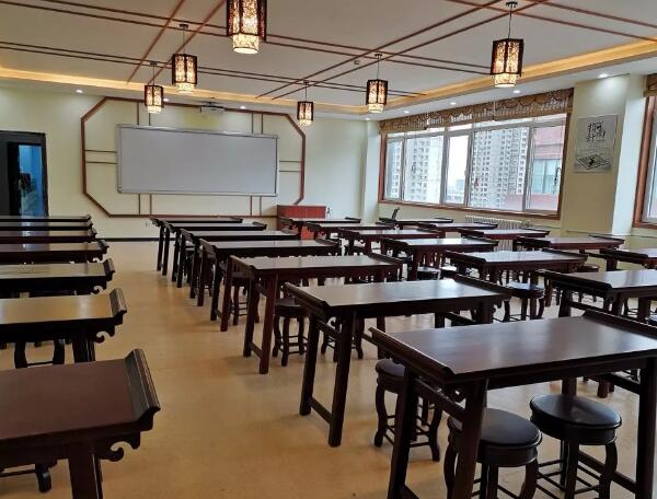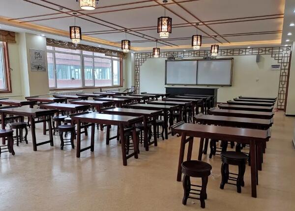 历史专用教室 历史教室古朴、大气,仿古的桌椅整齐地排列在教室中央,四周悬挂着绘有历史故事的挂画、窗帘,天花板装饰着极富古韵的壁纸,在雕花木板与仿古灯具的妆点下,仿佛穿越到了古代学堂。