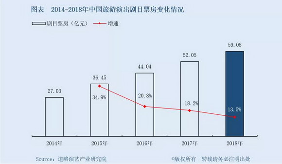 2018年主题公园旅游演艺仍保持较快发展速度,票房增长20.5%,票房占比达46.8%。实景旅游演艺仅增长5.7%,市场份额连续四年下滑。