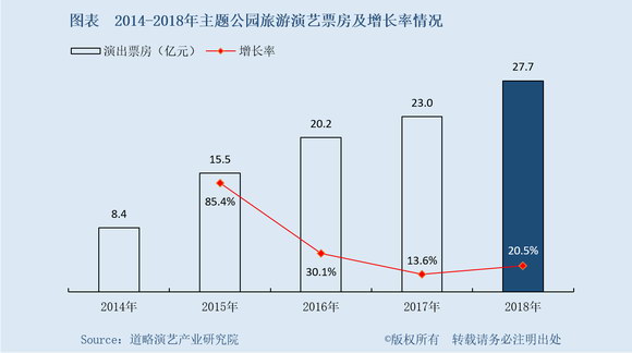 近五年票房持续增长,2018年增长21%。2018年主题公园旅游演艺新增14台,演出票房达27.7亿元,同比增长20.5%,增速迅猛,远高于旅游演艺整体增速。