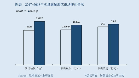 场次、观众保持较高增长,票房增速放缓。2018年,实景旅游演艺总演出场次达23137场,增长21.9%,观众接待量1530.9万人次,总票房增长5.7%,达15.6亿元。