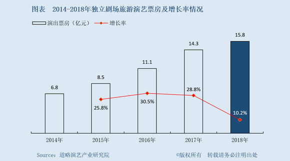 独立剧场旅游演出票房增长10%,增速放缓。2018年,独立剧场旅游演艺票房达15.8亿元,同比2017年仅增长1.5亿元,增长率仅为10.2%,增速明显放缓,低于旅游演艺整体增长。
