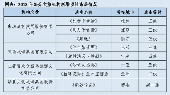 2018年旅游演艺新增的47台演出多位于二三线以下城市,共34台,占比高达72.3%,其中宋城演艺、陕旅集团等大型文旅机构新开发项目多位于三线及以下城市。