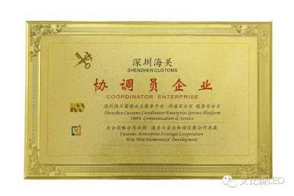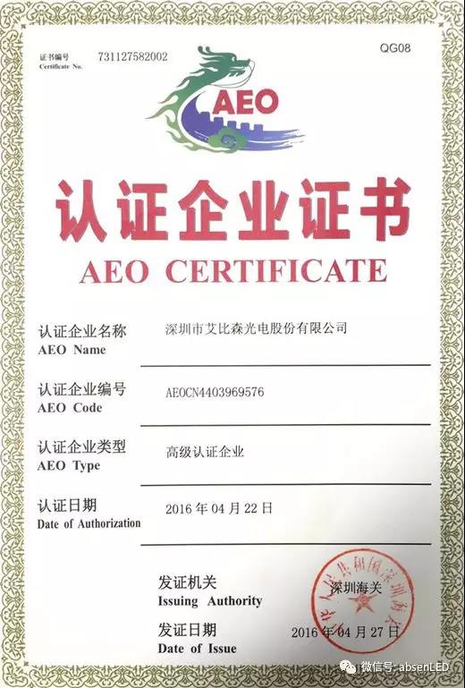 2015年艾比森获得了深圳海关协调员企业和中国外贸出口先导指数(ELI)样本企业等殊荣。2016年4月27日,艾比森正式成为了行业首家AEO高级认证企业。