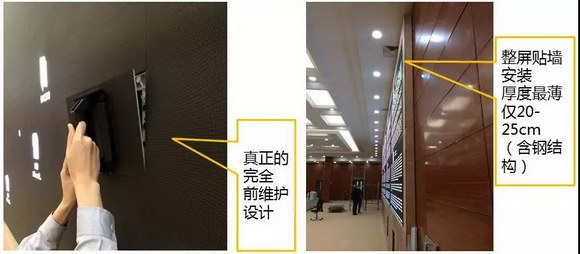 充分考虑到用户室内使用时对维护空间需求,台达小间距LED采用真正的前维护安装设计,此项设计明显有别于市场上的“模块前维护设计”,不仅显示模组可以进行屏前安装、维护,甚至包括显示箱体内部的控制系统、电源系统等所有零部件都完全实现了屏前维护。只需通过精准的磁吸式维护工具进行拆卸维护,操作简单易控,无需预留维护空间。无需背部专门的维护通道,为用户节约了大量空间,也从实际上体现了小间距LED产品超薄贴墙壁挂的设计意义。