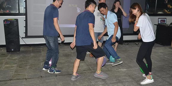 踩气球,一次上八个参赛者,分为两组,每人每个脚上绑上一个气球,游戏开始,看哪组最先将对方气球踩爆。如果是两组对战超过三分钟,则按踩爆气球的数量计算,爆的数量多的队伍就输。