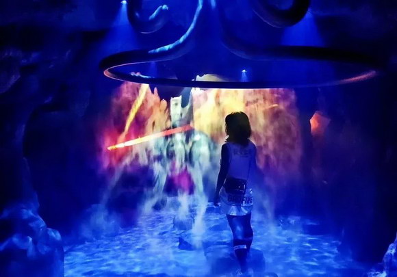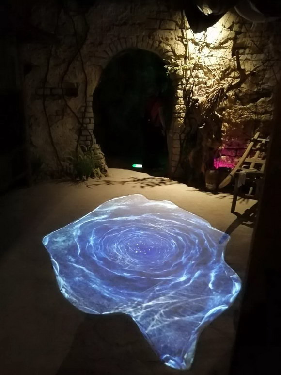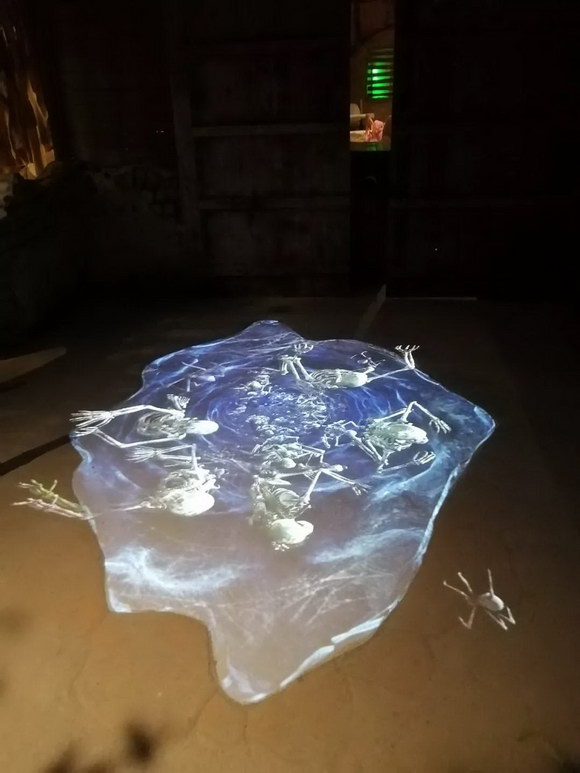 构思巧妙的地面互动投影,当你上一秒还沉浸在大话世界的情怀中时,下一秒地面就有骷髅突然冒出,化身一个大话西游主题的“鬼屋”。在不断递进的情绪感受中,把对电影经典IP的浸入式体验推至最高潮。