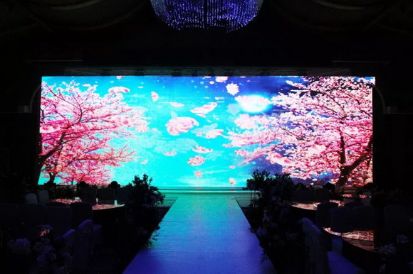 舞台对面是一个直径3米的公主台,该公主台采用一台NEC PA903X+(NP13ZL镜头)以垂直竖向投射方式打造。点亮投影机,公主台即刻变成一个多彩的大圆盘,当新娘穿着洁白的婚纱置身公主台,洁白的婚纱如施了魔法般即刻呈现出鲜花、火焰、星光等图案,瞬间成为全场的焦点。