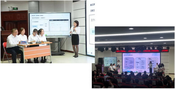 汽开区第十三小学语文团队现场展示了基于信息技术支撑下的校本研修。研修采用了翻转式、线上线下相融合的方式,围绕如何引领孩子说得精彩的核心问题,破解了教育教学中的实际问题,同步提升了教师的学科专业素养和信息技术应用能力,提供了一个信息技术应用能力提升工程与校本研修相融合的现场案例。其中教师汇报讨论应用的软件为希沃白板5,利用了思维导图以及板中板等功能实现归纳总结,并应用了希沃授课助手进行同屏互传,远程操控。