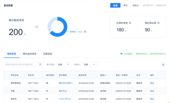 对于管理者来说,流量需要转化。招生管理系统专为管理者筛选高潜用户,提炼优质商机。系统无需用户提交报名,查看课程即可获取商机,记录课程行为轨迹,对客户进行分类,管理者提供精细化运营。