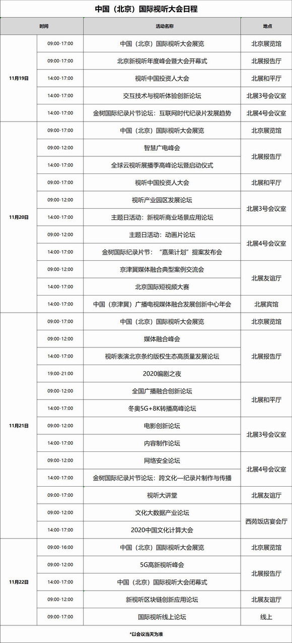 作为2020年规模最大的线下视听产业综合展会,首届中国(北京)国际视听大会主会场设在北京展览馆,大会开闭幕式于11月19日、11月22日在北京展览馆举办;线下展览11月19日至11月22日在北京展览馆举办,为期四天;专业论坛活动11月19日至11月22日分别在北京展览馆和西苑饭店举办。