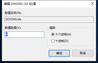 双击“EDIDMode”,选择“十六进制”,在“数值数据”内填入数字1或4,1表示关闭SmartEDID,4表示开启SmartEDID,点击“确定”。其功能效果同上所述。