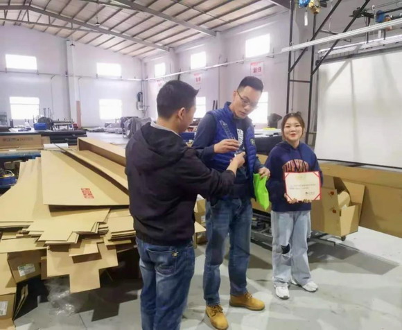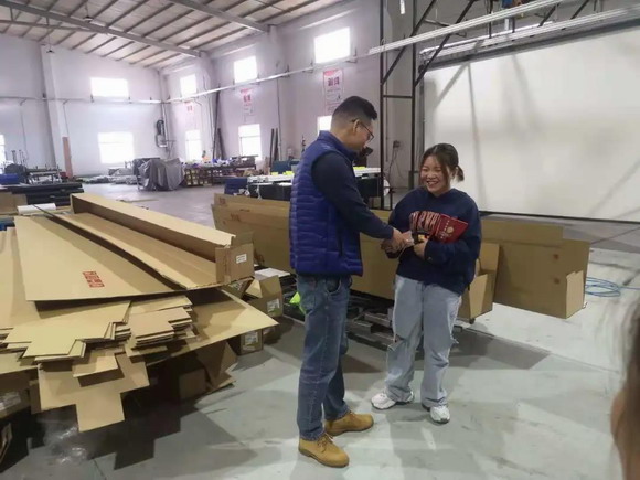 销售部戴总监给谢童鞋颁发'百万订单成就奖”。
