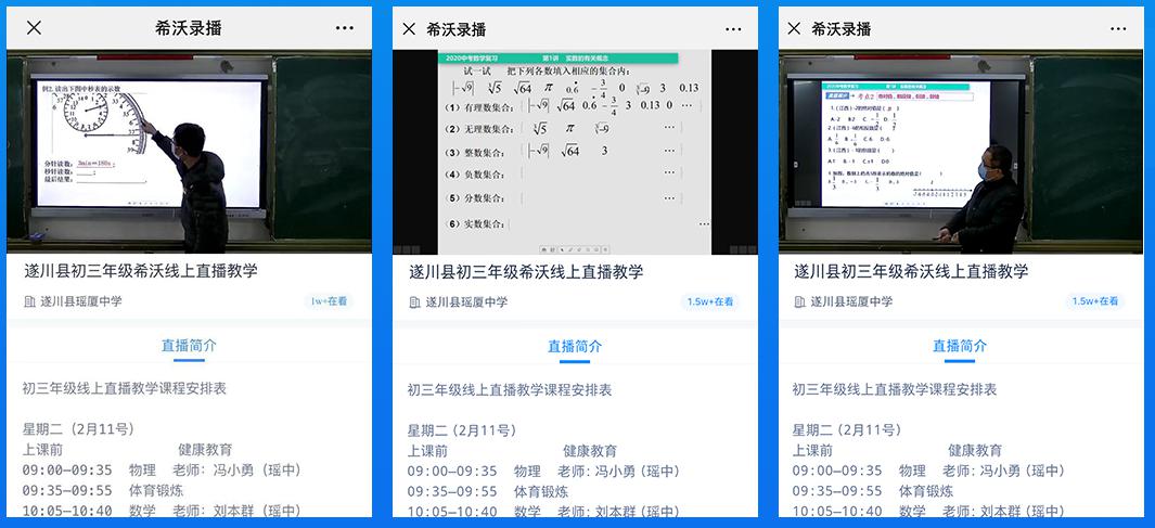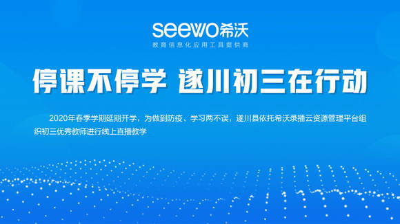 为贯彻落实《江西省各级各类学校2020年春季学期3月1日前不开学》精神,指导和帮助全县初三学生在寒假及春季学期延期开学期间,利用网络直播教学平台,科学合理安排好在家学习与生活,确保教学质量稳中有升,近期,江西省遂川县充分利用“互联网+教育”优势,依托希沃的 “希沃录播云资源管理平台”,实行初三年级课程直播,搭建线上教学平台,免费为全县初三学生在春季学期延期开学期间提供线上远程辅导答疑服务,做到防疫期间的宣传教育及心里辅导。