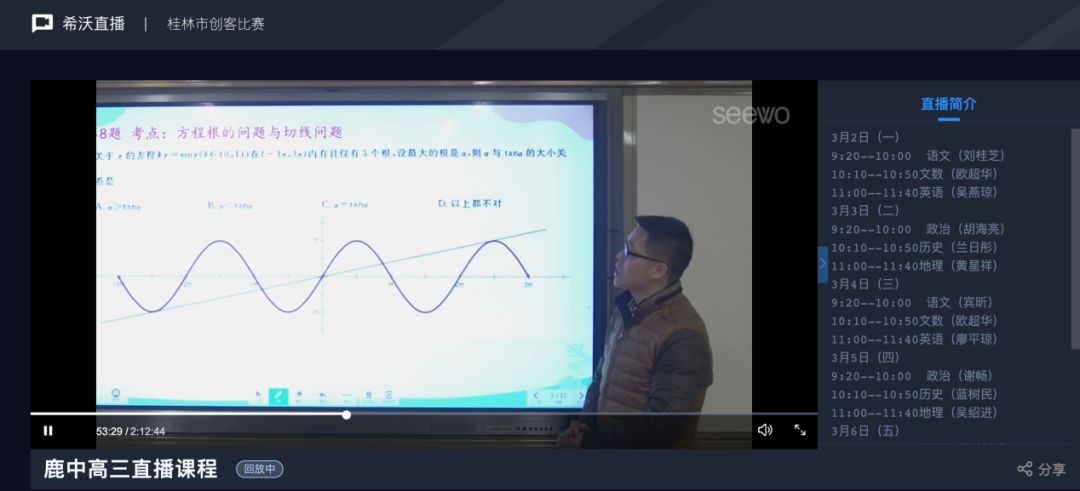 据悉,鹿寨中学初步预计开展30节直播课,截止3月4日,共计约5000人次学生参与直播课堂,单堂课最多观看人数达832人。鹿寨中学蓝校长表示,疫情期间,学校高考备考小组不畏艰难,不断商讨最优的教学安排,与希沃公司反复沟通直播录播细节,孜孜不倦地在线上为高三学子答疑解惑,希望通过此次希沃直播课堂,给学生带来信心,无惧疫情共逆行,冲刺百日换新天。