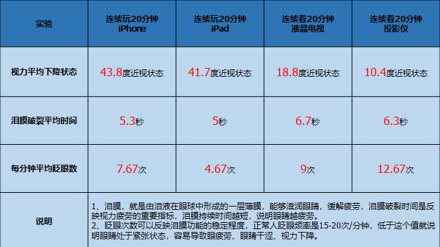 这3位医务人员拿自己孩子花4天做了一个实验,分别让3个孩子观看iphone、ipad、42吋液晶电视和投影仪,通过对孩子的屈光度、泪膜破裂时间和一分钟眨眼次数的前后变化,来判断他们对孩子视力的伤害程度。