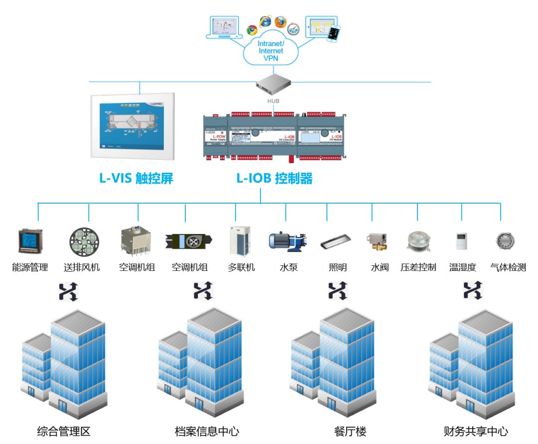 项目涉及园区多个不同楼宇的控制,加大了跨建筑物与跨系统的多点数应用,台达以建置成本为考量,采用新推出的LOYTEC L-IOB-589控制器作为主要核心系统产品。除因其每个控制器都配置26个I/O点数能充分支持多点数应用外,同时,因其自带一个Modbus RTU通讯接口,不需额外加购其他设备来进行转换,如此一来,至少可替客户节省20%以上建置成本。