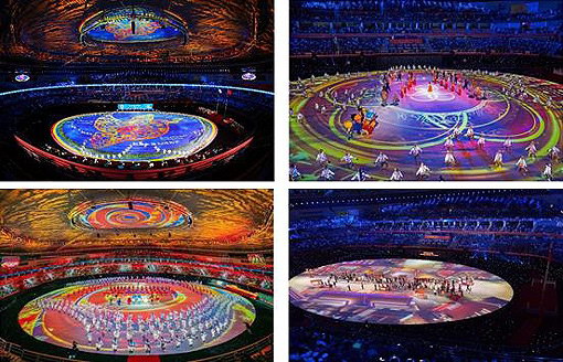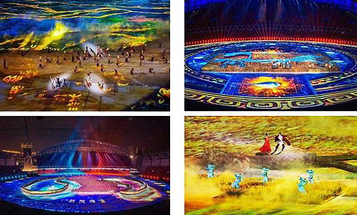 开幕式以“和平的薪火”为主题,文艺表演气势恢宏。共分为上篇《泱泱中华·生生不息》以及下篇《和平之师·美美与共》两个篇章,总共2个多小时的仪式与表演在2万多平米的全球最大的全三维立体式舞台上进行。Digital Projection 激光投影机利用其先进稳定的投影技术,对主场地的地面、文艺演出中的雾幕、纱幕等进行投射,并与现场其他声光电显示设备相互配合,展示出了全体中华儿女自古以来对和平的渴望与追求,以及这个东方古国的文化底蕴与当代社会的勃勃生机!