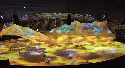 当晚的《丝绸之路》作为诸多亮点中的一场,成为不少观众心中最难忘的一幕。在舒缓的音乐声中,空中升起一面巨大的丝绸,在体育馆上空缓缓铺展开来。 DP Titan laser 37000 WU激光投影机以其40000流明的中心亮度参与对纱幕进行投射,使得场地中央出现了丝绸与地面的沙漠相连,驼队、商人在“沙丘”上前行的精彩场景。
