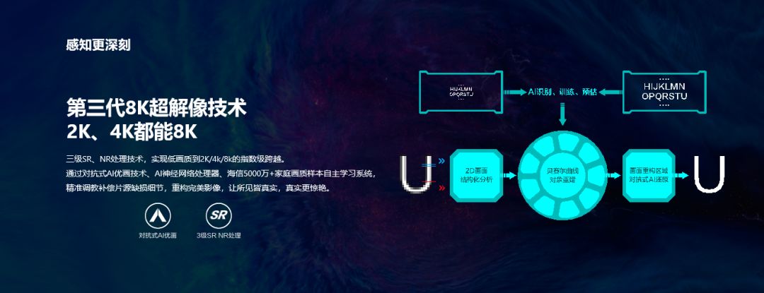 当然,除去在帧数上的优化外,海信电视还特别研发了第三代8K超解像技术,可以实现从低画质片源到2K、4k、8k画质的三级优化。配上对抗式AI技术,海信8K Pro双屏电视U9可实时构建场景模型,对设备没有拍摄出来的物体细节进行AI场景补偿,让图像更趋近肉眼可见的真实世界,让用户能够得到更加清晰的观影体验。