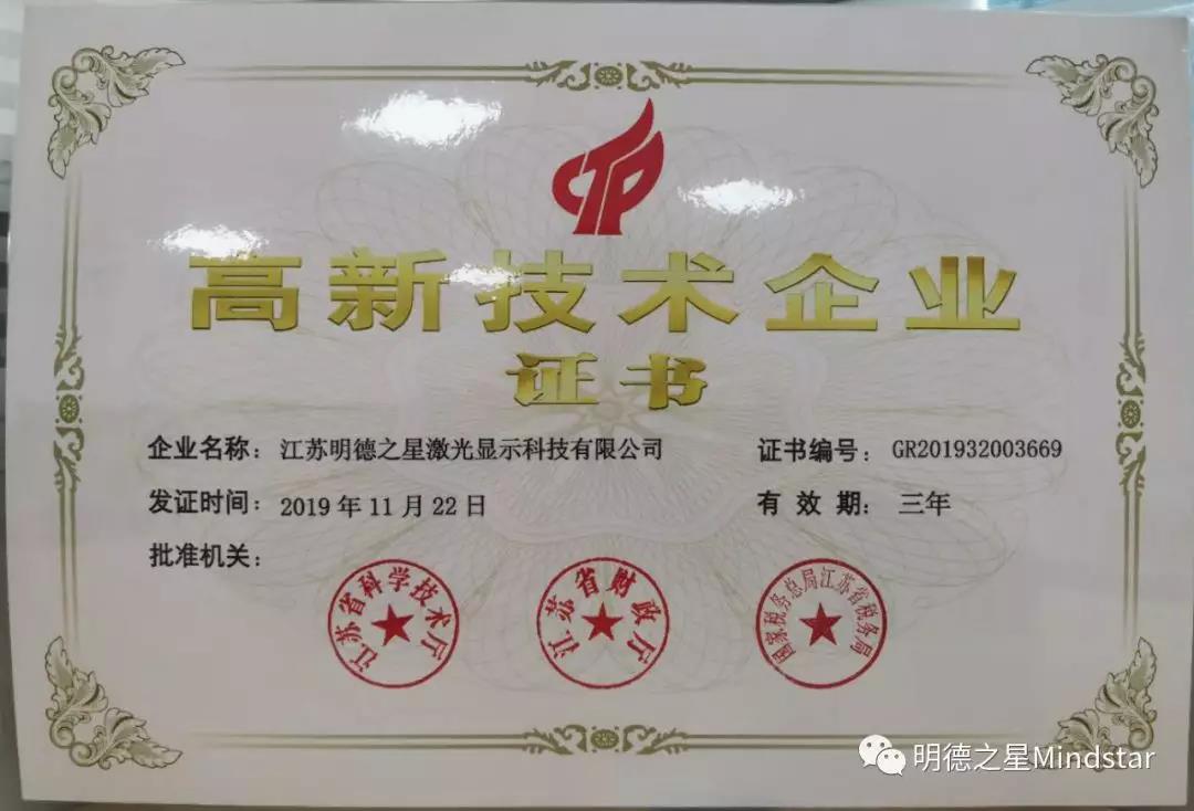 明德之星凭借自主研发的激光超短焦、长焦投影机、工程机、激光器等项目,成功获得国家高新技术企业认定: