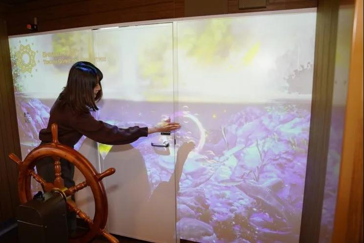驾驶室背面的墙壁上,大屏画面展示驾驶室视角拍摄的画面及互动体验画面,互动体验展示了海底世界,当手触及画面的鱼儿,鱼儿会跳跃起来,一定记得亲自试试哦。你的乘车体验会更加丰富有趣。