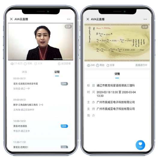 2月6日,阿拉善盟第一中学在奥威亚录播教室和移动录播设备支撑下,顺利组织高三学子开展“空中课堂”,这也是内蒙古自治区第一个实施疫情期间“停课不停教、不停学”的学校。通过奥威亚云直播技术,学生只需在家通过手机、平板、电脑等便携方式即可进行听课,真正实现在“师生不聚集”前提下,开展教学活动。