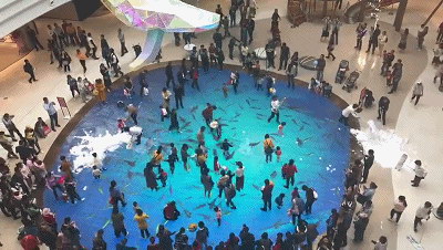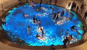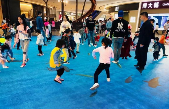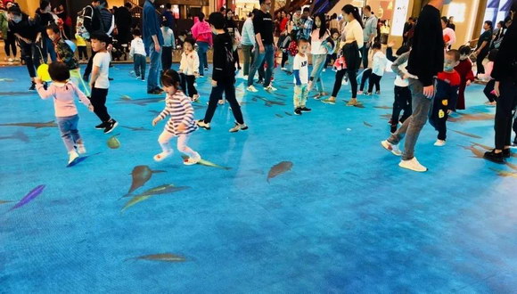 当人们走过时,地上的海洋精灵仿佛有所感应,四散游去。小孩子们则开始了一场追逐地上游动小鱼的游戏,嬉戏打闹中,享受着愉快的亲子时光。