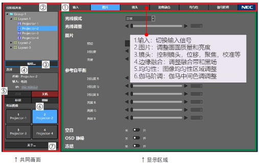 特别值得一提的是,PX2000UL+采用NEC全新的投影辅助工具ProAssist,支持画面模式和参数调整、镜头各项控制调整、边缘融合调校、图像分区域均匀性调整、伽玛中间色调调整、摄像头多机颜色校准等多类调整,并支持群组多机控制,方便地实现对投影机的控制和调整。