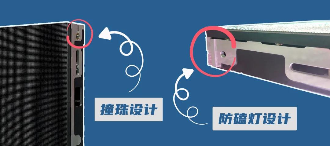 ▶ 撞珠设计:箱体具有撞珠设计,安装时可通过听取撞珠嵌入凹槽的声音来确保箱体之间拼接到位,保证大屏整体的平整度。