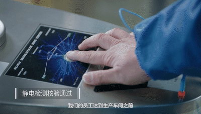 ↑ 员工进入生产车间之前,都要进行严格的静电检测,以及穿戴标准检测。