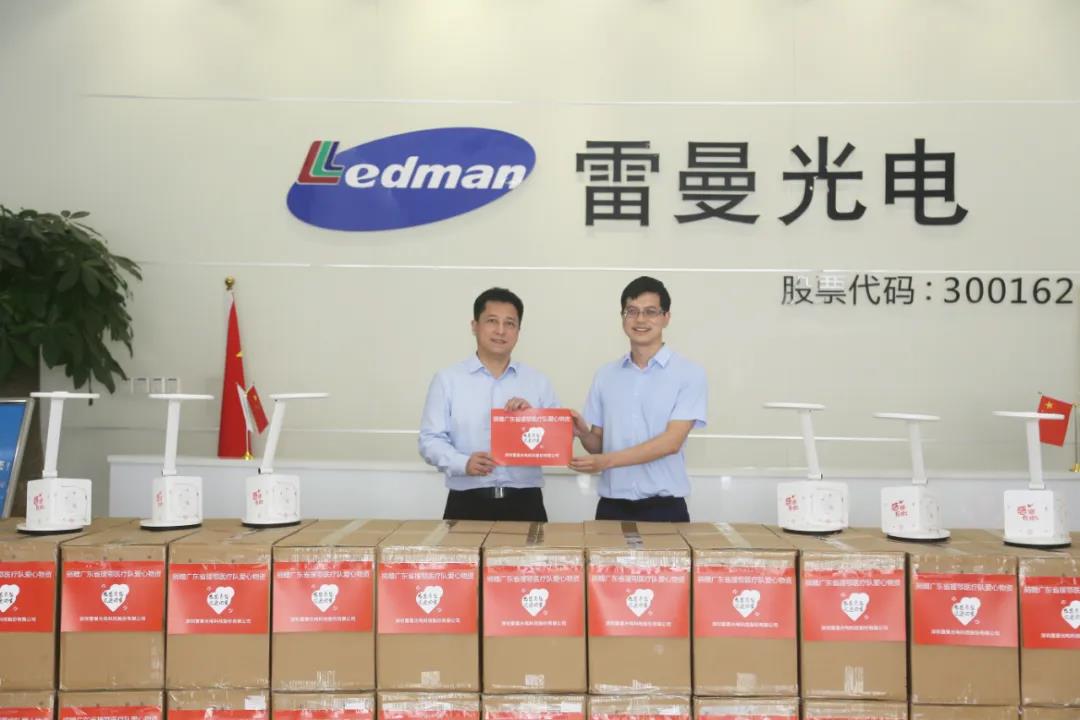 为感谢这些在突如其来的新冠疫情面前,义无反顾冲上一线,用自身的血肉之躯,筑起一道道生命防线的援鄂医护人员,深圳市照明与显示工程行业协会联合广东省卫生健康委员会、广东省工商联,开展 LED护眼台灯捐赠活动,由雷曼拓享(雷曼光电全资子公司)等六家企业、为广东医疗队 2495 名队员每人赠送一盏 LED 护眼台灯。