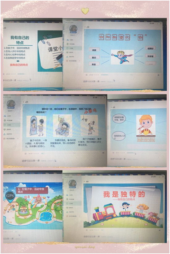为了线上教学的新模式,负责《道德法制》的周老师和田老师,从头开始研读教材,梳理教案,制作课件,一次次的试讲后才有正式线上教学时的自信与挥洒自如。